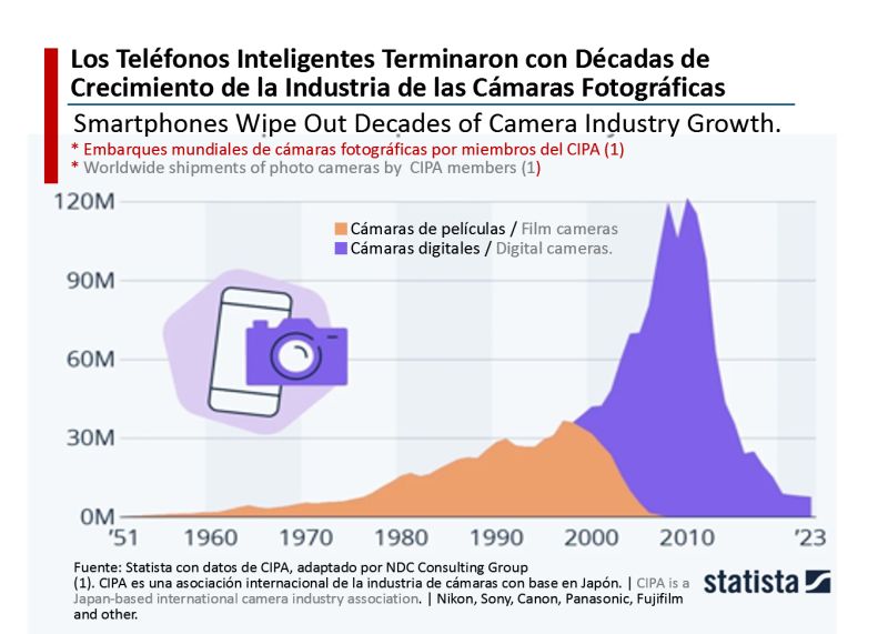 Sin embargo, en el mundo empresarial, el escenario empresarial normalmente estΓ‘ en cambio y puede cambiar drΓ‘sticamente en poco tiempo. Como muestra podemos mencionar la industria de las cΓ‘maras fotogrΓ‘ficas, donde el desarrollo de las cΓ‘mara digitales vino a destruir prΓ‘cticamente la industria de las cΓ‘maras que utilizaban rollos de pelΓcula en cuestiΓ³n de unos pocos aΓ±os. Las cΓ‘maras digitales, a su vez, sufrieron las mismas consecuencias con la apariciΓ³n de los telΓ©fonos inteligentes con cΓ‘maras incluidas. Esto significΓ³ la quiebra de muchas empresas que no pudieron adaptarse al cambio.